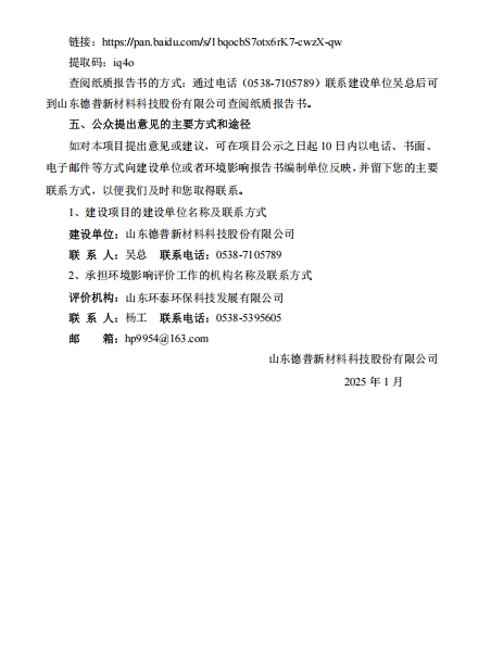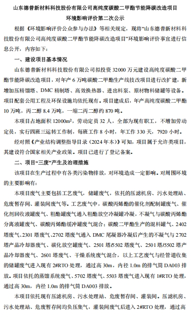 | 山東德普新材料科技股份有限公司高純度碳酸二甲酯節(jié)能降碳改造項目 環(huán)境影響評價第二次公示 | |